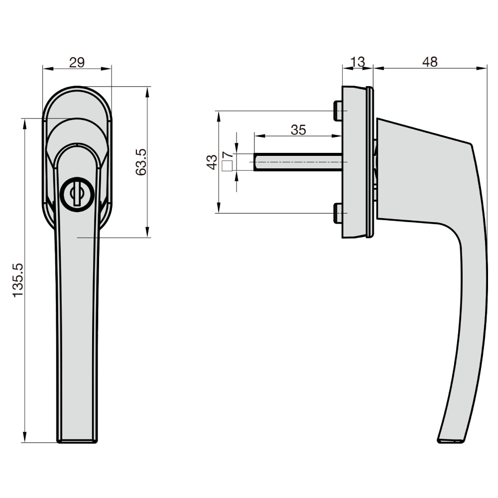 •zárható alumínium ablakkilincs•minden szabványos•bukó-nyíló ablakhoz használható•utólagosan beépíthető•gyerekzárként is használható•kilincstengely: 7 mm•kilincstengely hossz: 35 mm•kilincs hossz: 135.5 mm•kilincs mélység: 61 mm•2 db kulccsal áruljuk