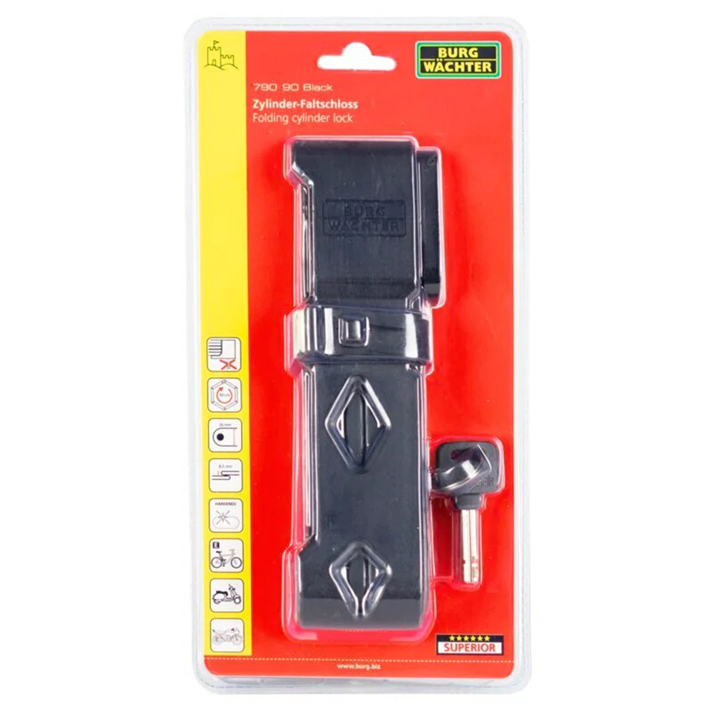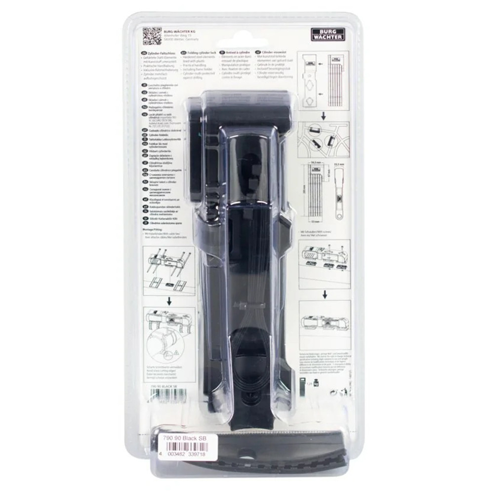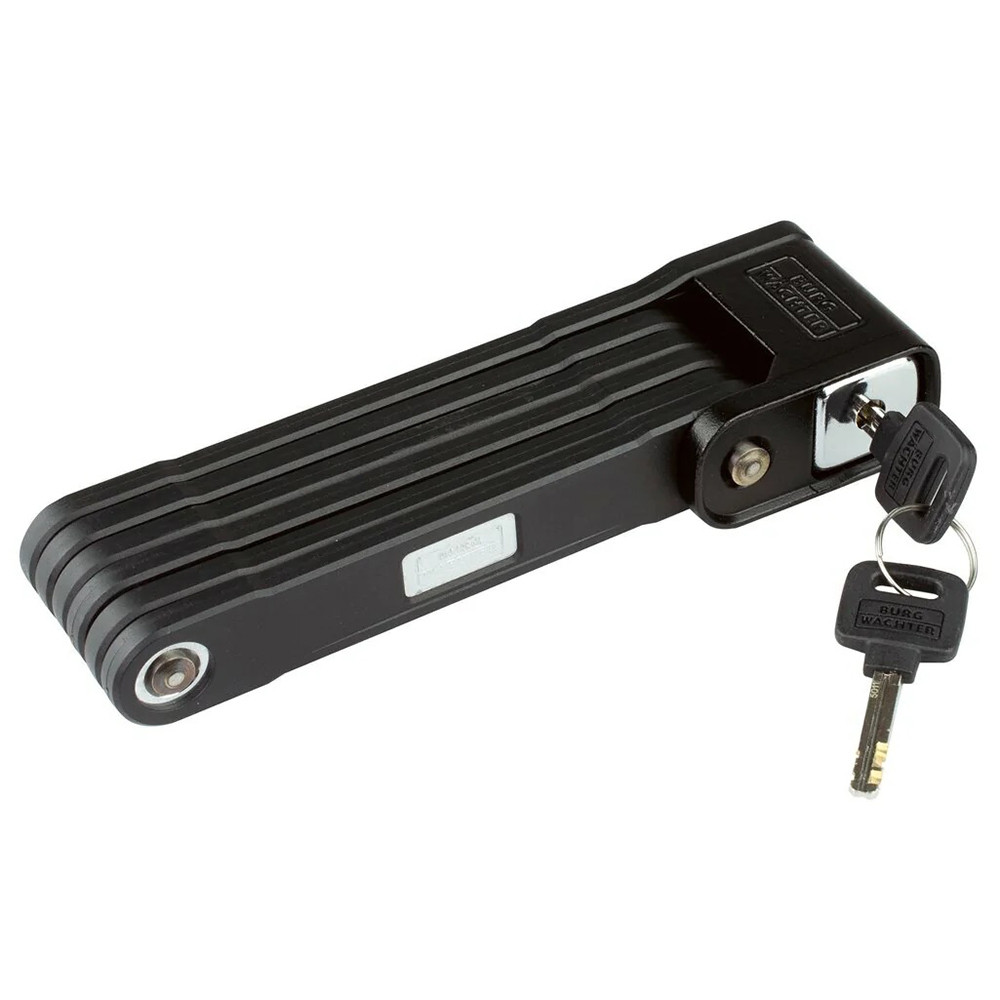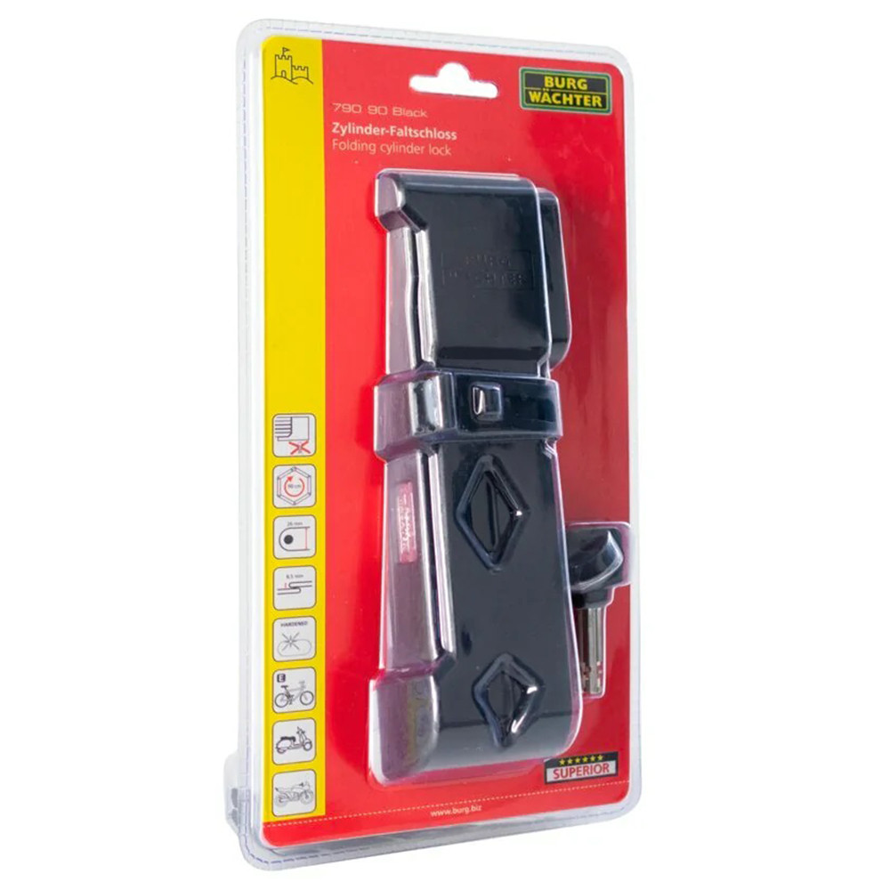• robusztus összecsukható zár • maximális védelem feszítőszerszámok ellen • 8,5 mm vastag, 26 mm széles edzett acéllemezekből • 90 centiméteres teljes hossz • műanyag bevonat véd a karcoktól • gyors és egyszerű összecsukás • könnyen elfér a táskában • fúrásvédett hengerzár • kettő darab kulccsal • praktikus kerékpártartó • csekély 1,3 kilós súly
