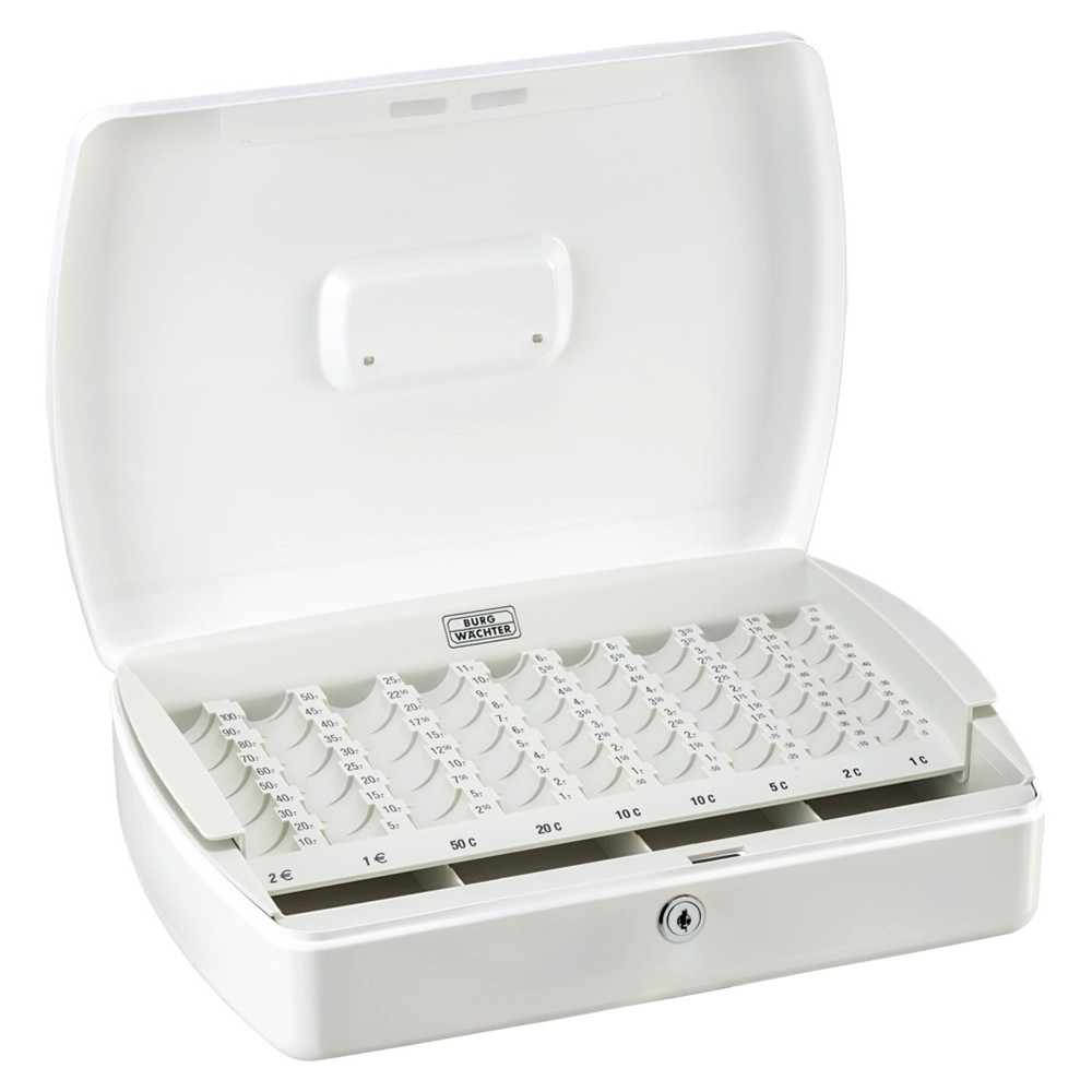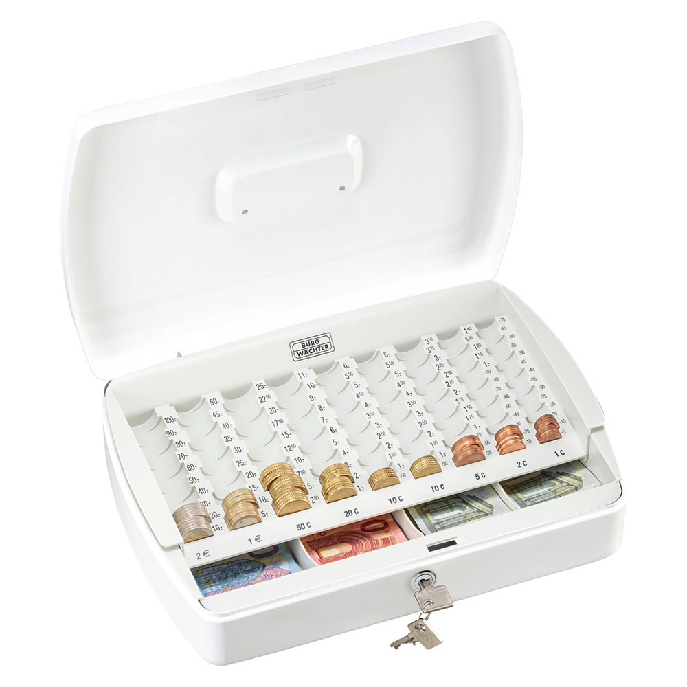 • minőségi pénztárkazetta • erős acéllemez test és fedél • masszív belső zsanérozás • elegánsan ívelt forma • süllyesztett fém fogantyú • kivehető műanyag pénzérme tálca • 1, 2, 5, 10, 20, 50 Cent, 1, 2 Euro-s érmékhez • alatta kivehető műanyag bankjegytartó • minőségi 5 csapos cilinderzár • kettő darab kulccsal • kétféle méretben • fehér színben • papírpénztartó betétek: • ZK 2257 típusnál: 3 rekesz (ZE 250 EURO) • ZK 2307 típusnál: 4 rekesz (ZE 300 EURO) • betétek külön is rendelhetőek • nyerskulcs típusa: 65L
