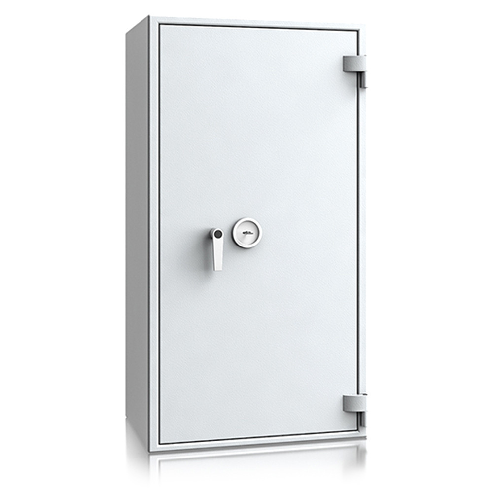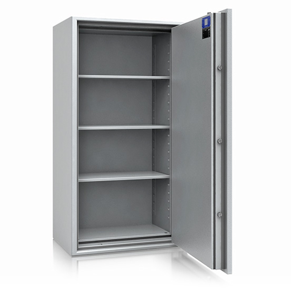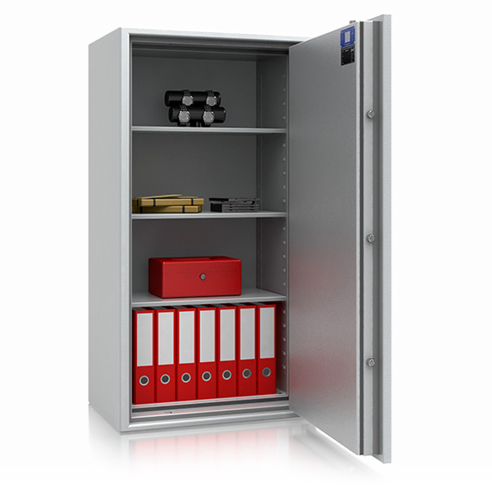 • 60 perces tűzállóság dokumentumok részére • 1090C-on a belső hőmérséklet 150C alatt marad • többrétegű acél test, speciális hőszigetelő töltettel • 95 mm vastag, többrétegű acél ajtó, speciális töltettel • speciális füst,- és vízszigetelő tömítés az ajtóban • 180 fokos ajtónyitás a külső zsanéroknak köszönhetően • háromirányú zárás, 25 mm-es kerek, acél hevederekkel • erős rögzítő fülek a zsanéroldalon • felfúrás ellen mangán acéllappal védett zárszerkezet • állítható magasságú polcok • rögzítő furat lefelé • világosszürke (RAL 7035) szín