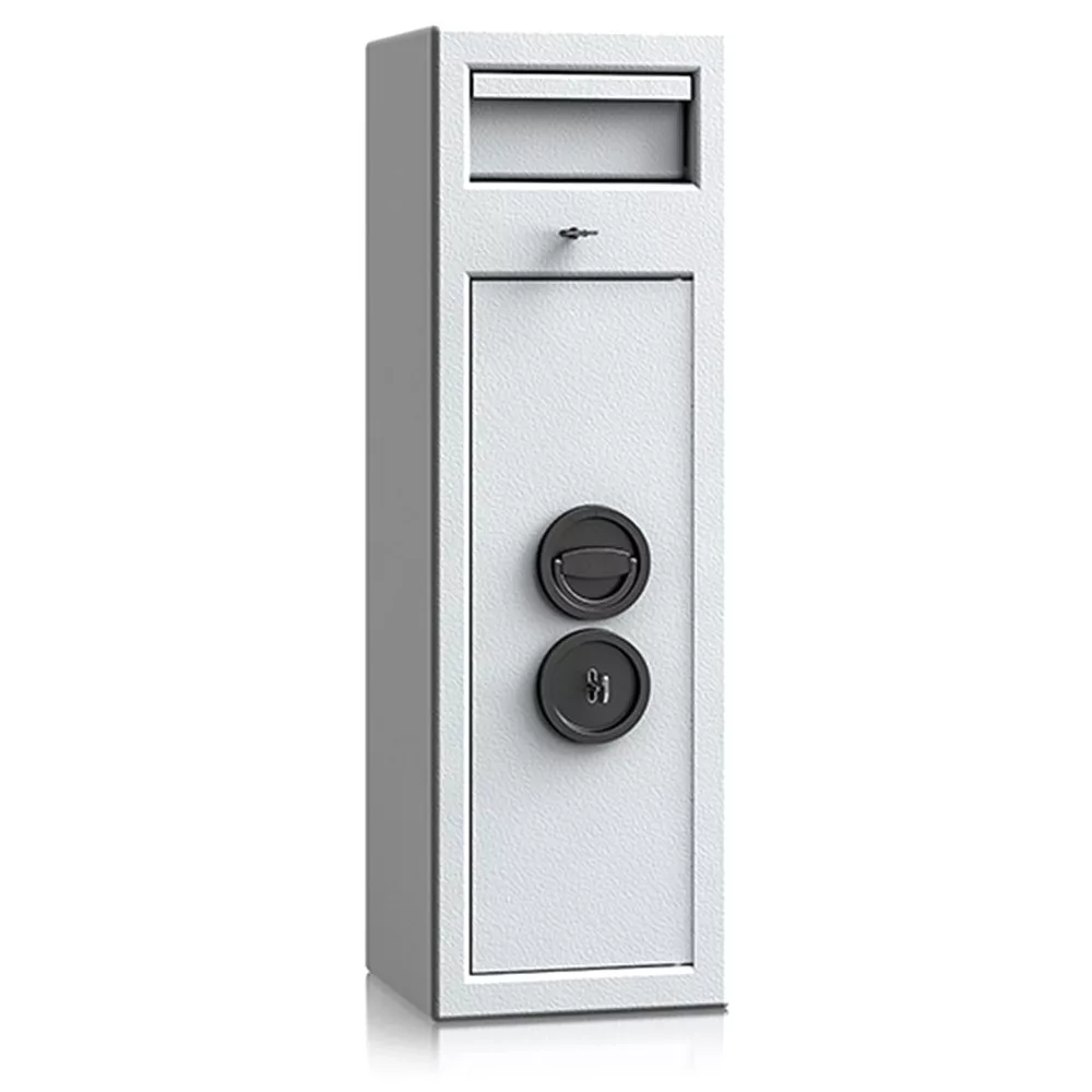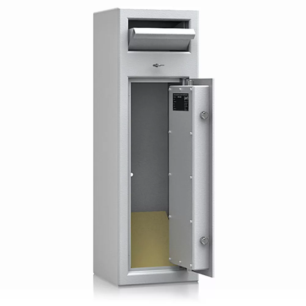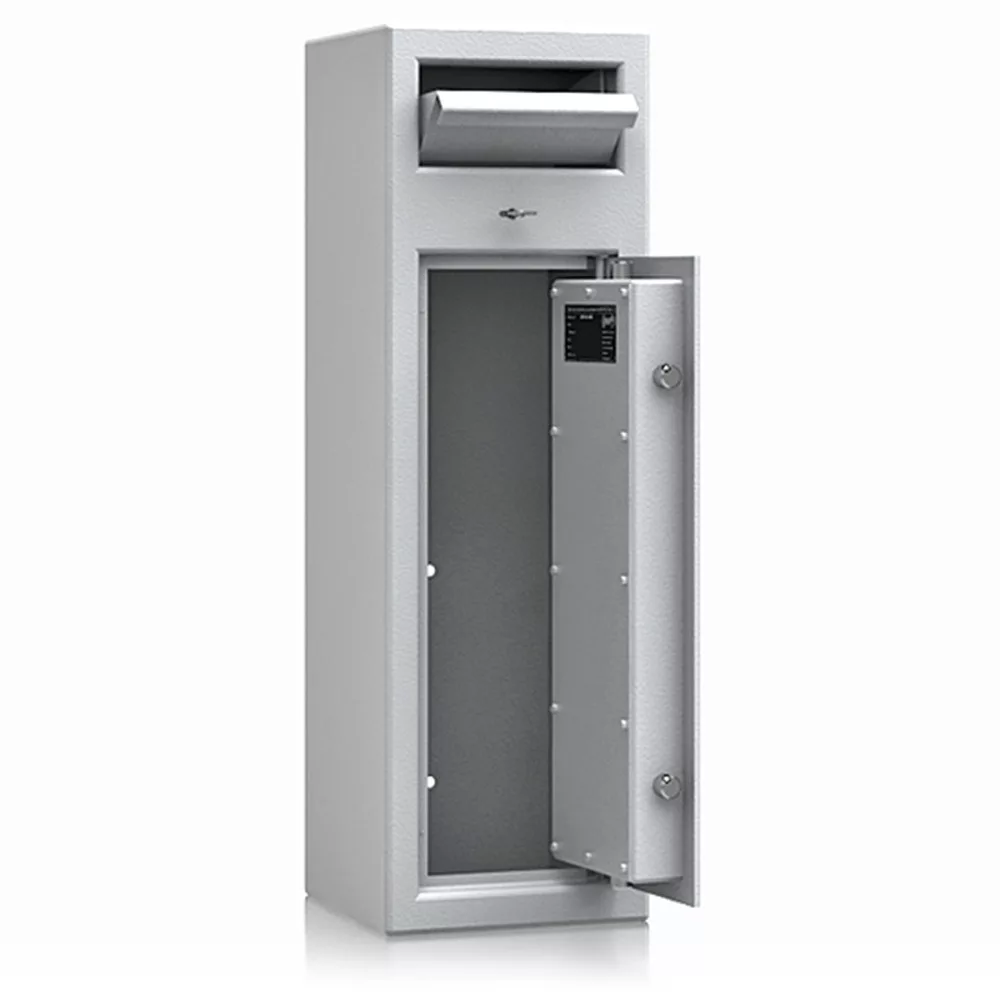 • lefelé nyíló csúszdás bedobó szerkezet • bedobó nyílás külön zárható (2 db kulccsal) • maximális kihalászás elleni védelem • 3 mm vastag egyfalú acél test • 52 mm vastag duplafalú ajtó, 6 mm-es acél borítással • 90 fokban jobbra nyíló ajtó, belső zsanérokkal • háromirányú zárás, kerek acél hevederekkel • felfúrás ellen mangán acéllappal védett zárszerkezet • alapkivitelben duplatollú kulcsos zárral, 2 db kulccsal • felár ellenében más zárral is rendelhető • 12 mm-t kiálló fém fogantyú • rögzítő furatok lefelé és hátrafelé • biztosítási értékhatár: 1 500 000 Ft, riasztórendszerbe kötve: 3 000 000 Ft