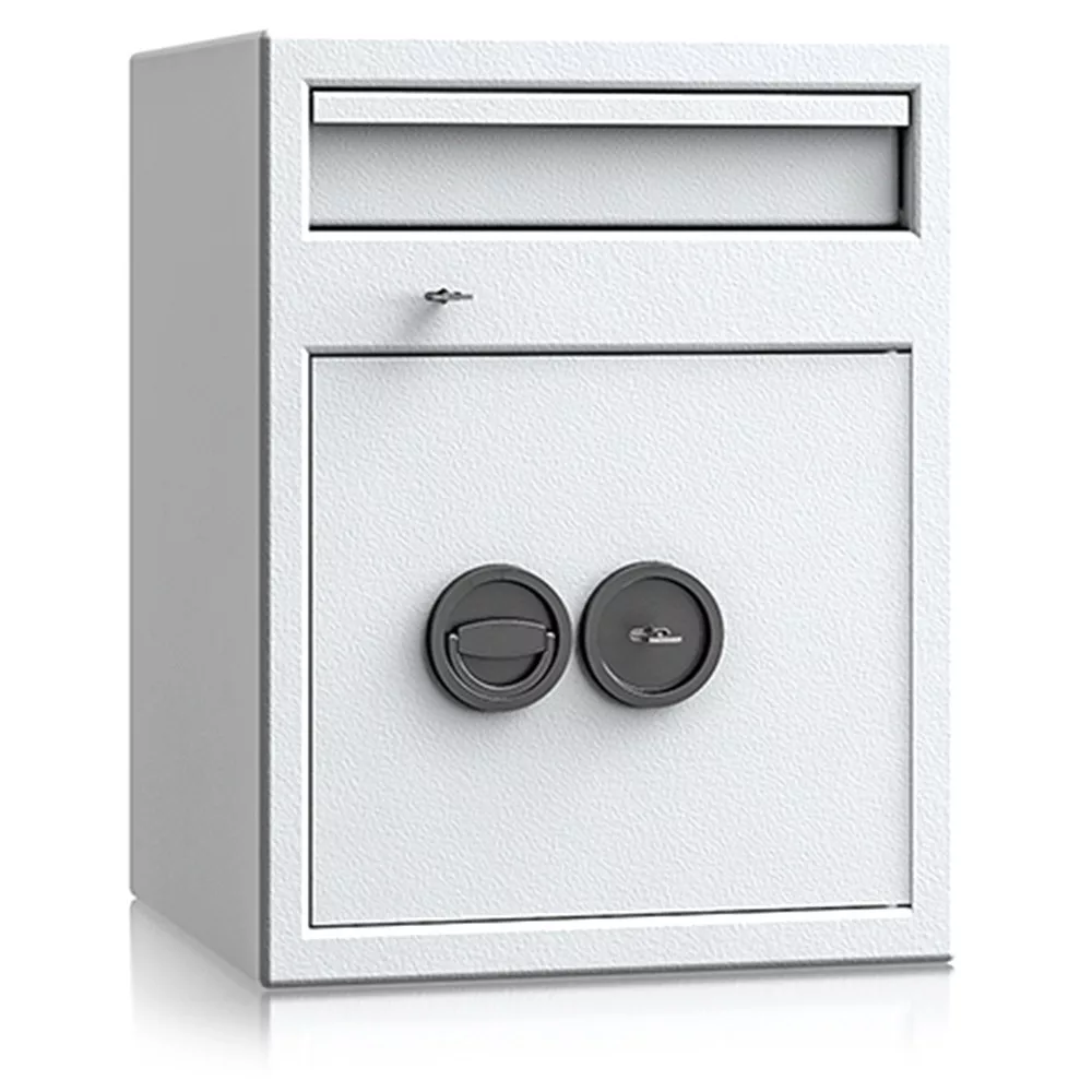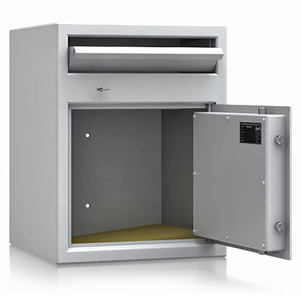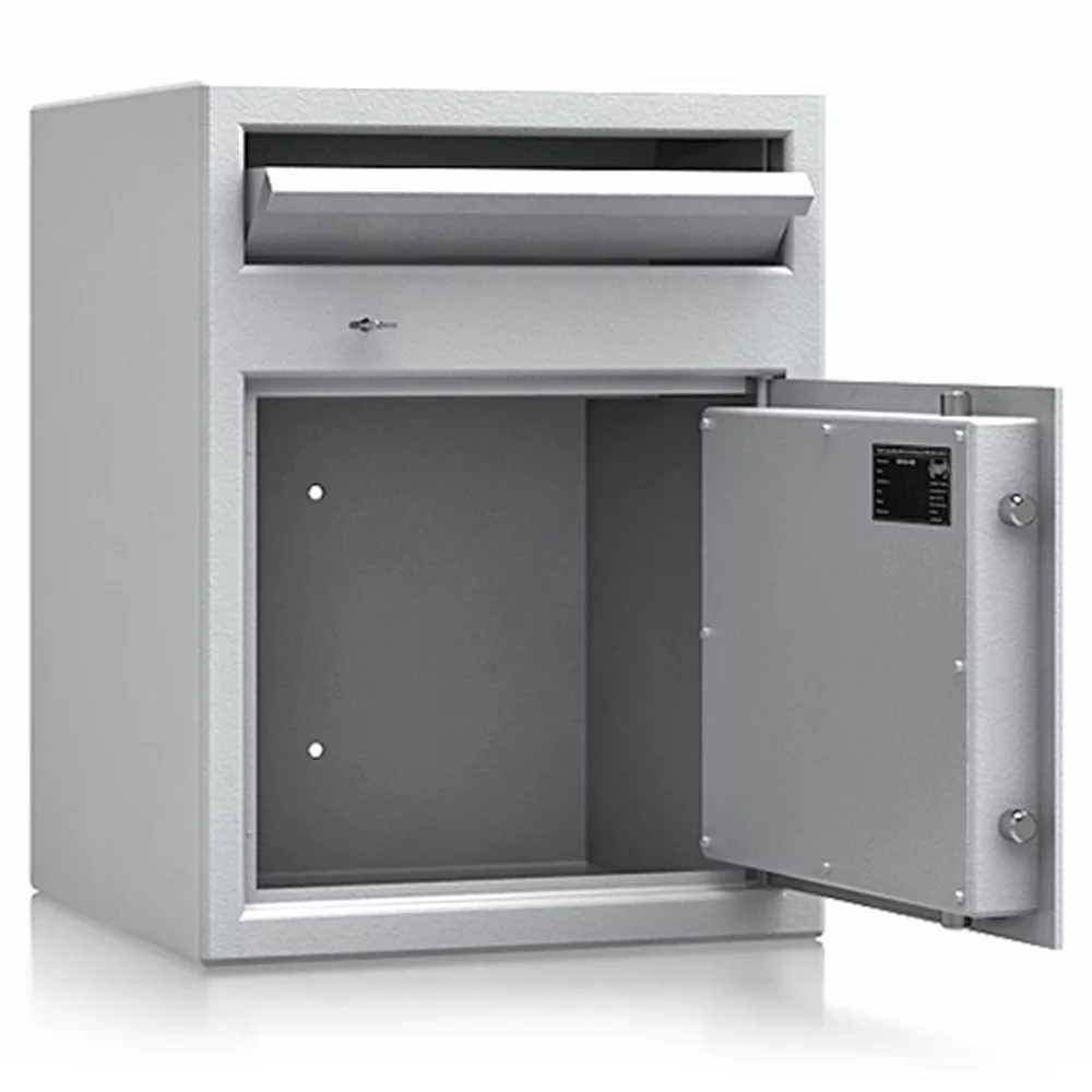 • lefelé nyíló csúszdás bedobó szerkezet • bedobó nyílás külön zárható (2 db kulccsal) • maximális kihalászás elleni védelem • 3 mm vastag egyfalú acél test • 52 mm vastag duplafalú ajtó, 6 mm-es acél borítással • 90 fokban jobbra nyíló ajtó, belső zsanérokkal • háromirányú zárás, kerek acél hevederekkel • felfúrás ellen mangán acéllappal védett zárszerkezet • alapkivitelben duplatollú kulcsos zárral, 2 db kulccsal • felár ellenében más zárral is rendelhető • 12 mm-t kiálló fém fogantyú • rögzítő furatok lefelé és hátrafelé • biztosítási értékhatár: 1 500 000 Ft, riasztórendszerbe kötve: 3 000 000 Ft