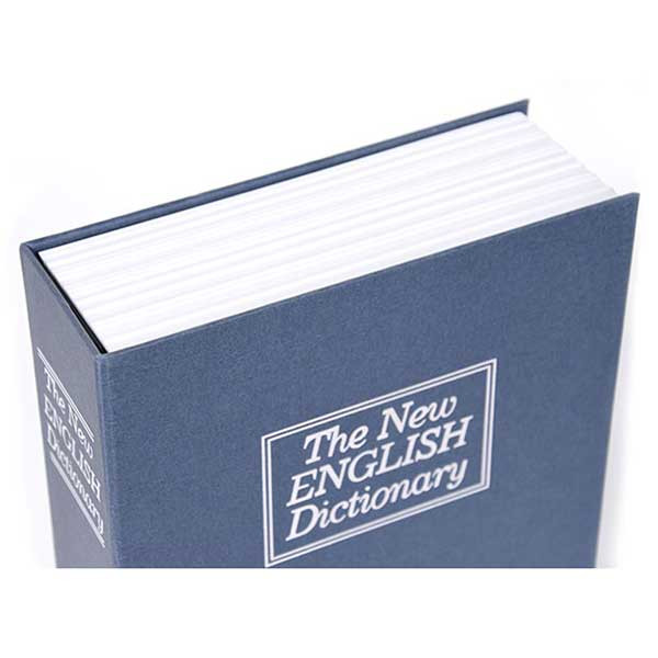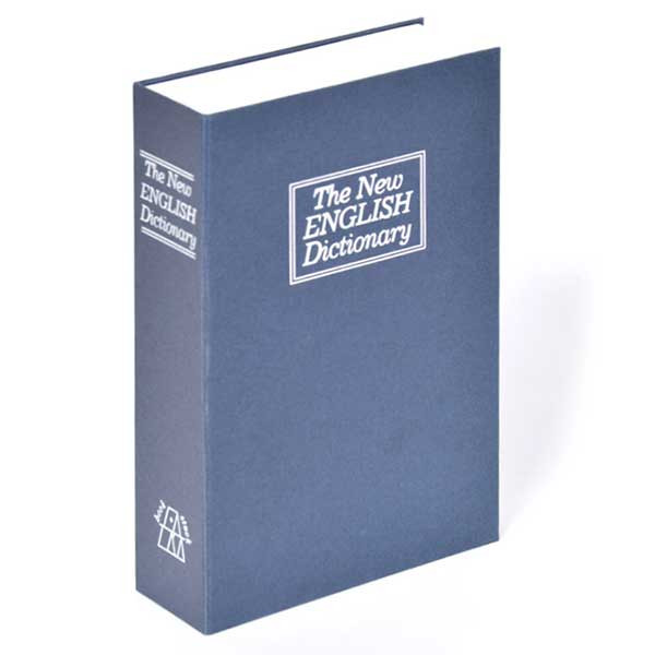 • könyv alakú acéllemez ház és fedél • kék pórszórt bevonattal • angol szótárt szimbolizál • könyvespolcon könnyen elrejthető • egyszerű lamellás zár, kettő darab kulccsal