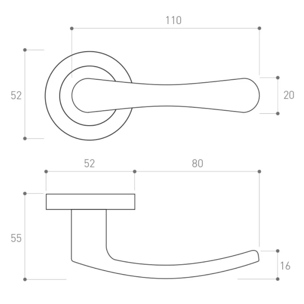 •alumínium ajtókilincs•klasszikus beltéri ajtókhoz•kör rozetta és ívelt kilincs forma•mindkét oldalon rugós mechanizmussal•kilincs lenyomás után visszaáll vízszintes helyzetbe•105 mm hosszú, 8 x 8 mm-es kilincs tengely•70 mm hosszú (méretre vágható) rögzítő csavar•zártakaró rozetta küldöm kapható•felszereléshez szükséges anyagokkal•többféle színben áruljuk•kilincs hossz: 110 mm•rozetta átmérője: 52 mm