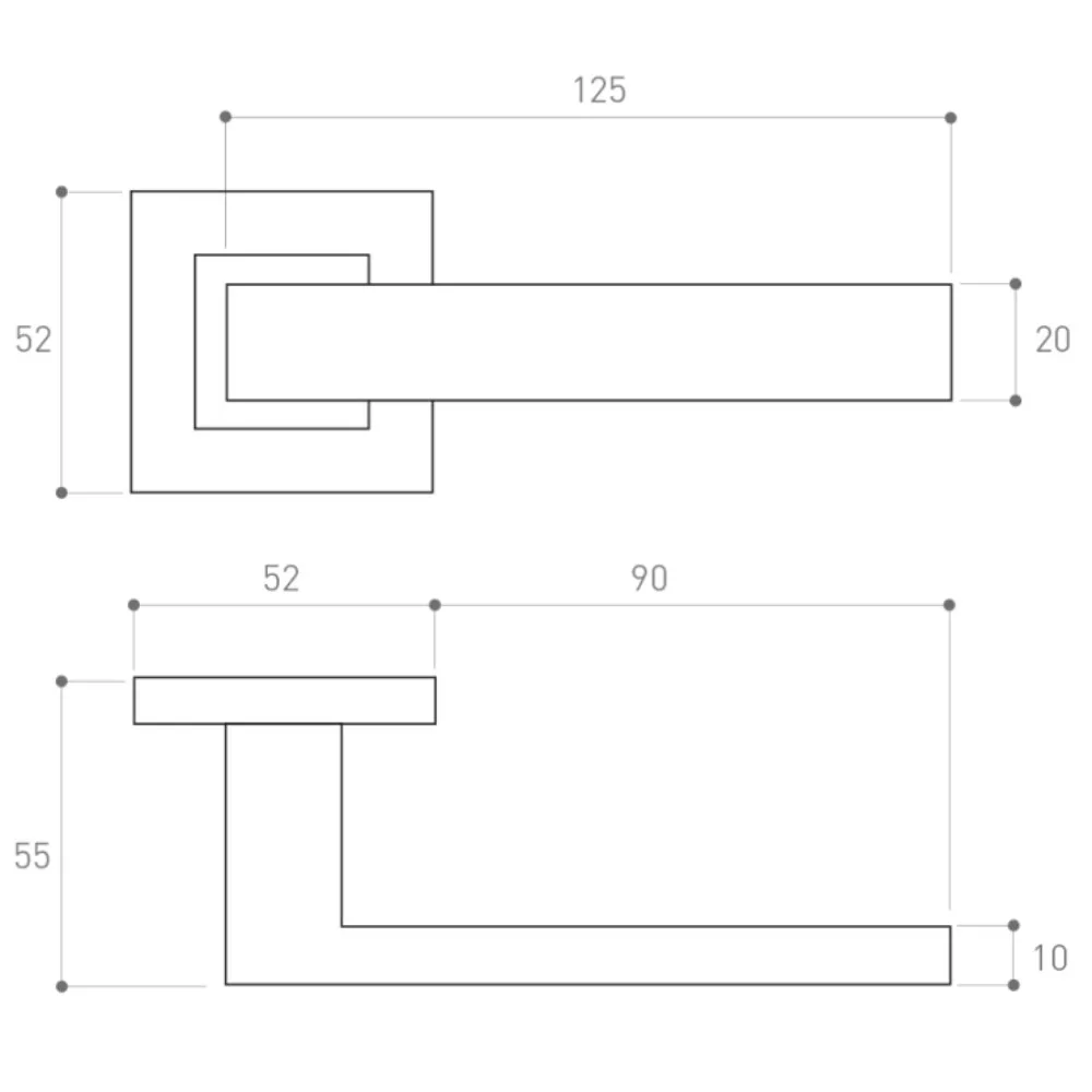 •rozsdamentes acél ajtókilincs•modern beltéri ajtókhoz•szögletes rozetta és kilincs forma•mindkét oldalon rugós mechanizmussal•kilincs lenyomás után visszaáll vízszintes helyzetbe•105 mm hosszú, 8 x 8 mm-es kilincs tengely•70 mm hosszú (méretre vágható) rögzítő csavar•zártakaró rozetta küldöm kapható•felszereléshez szükséges anyagokkal•többféle színben áruljuk•kilincs hossz: 125 mm•rozetta méret: 52 x 52 mm