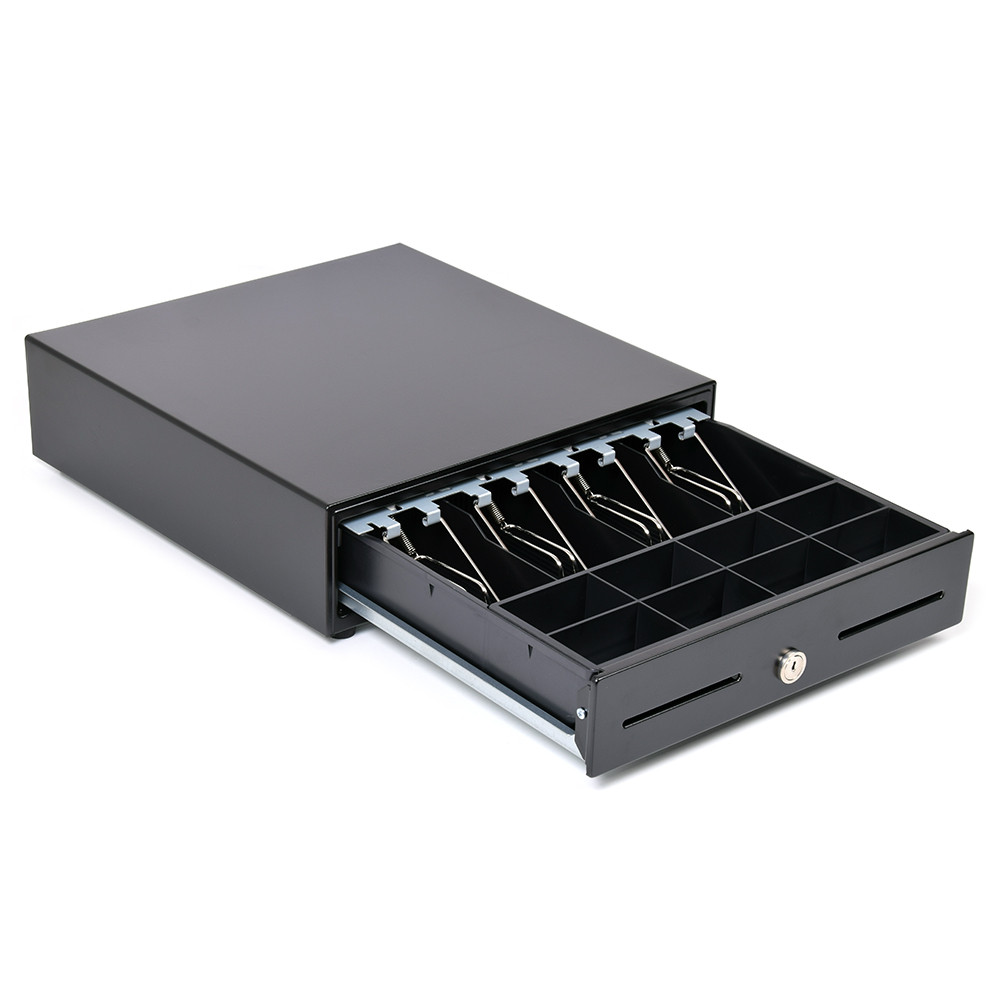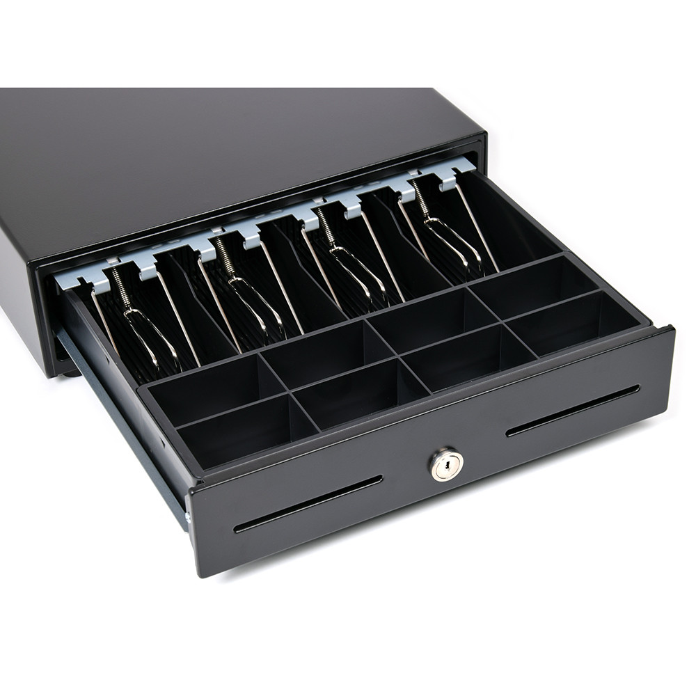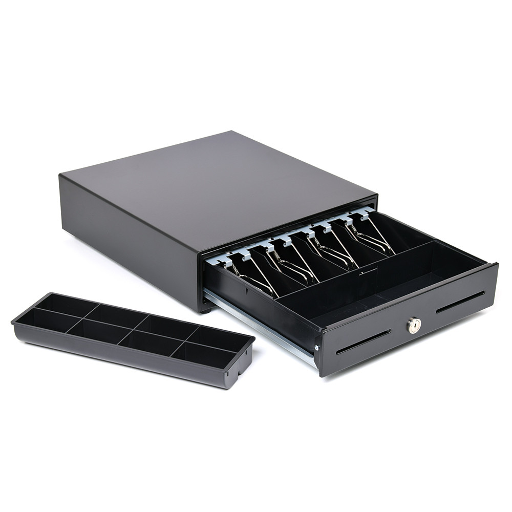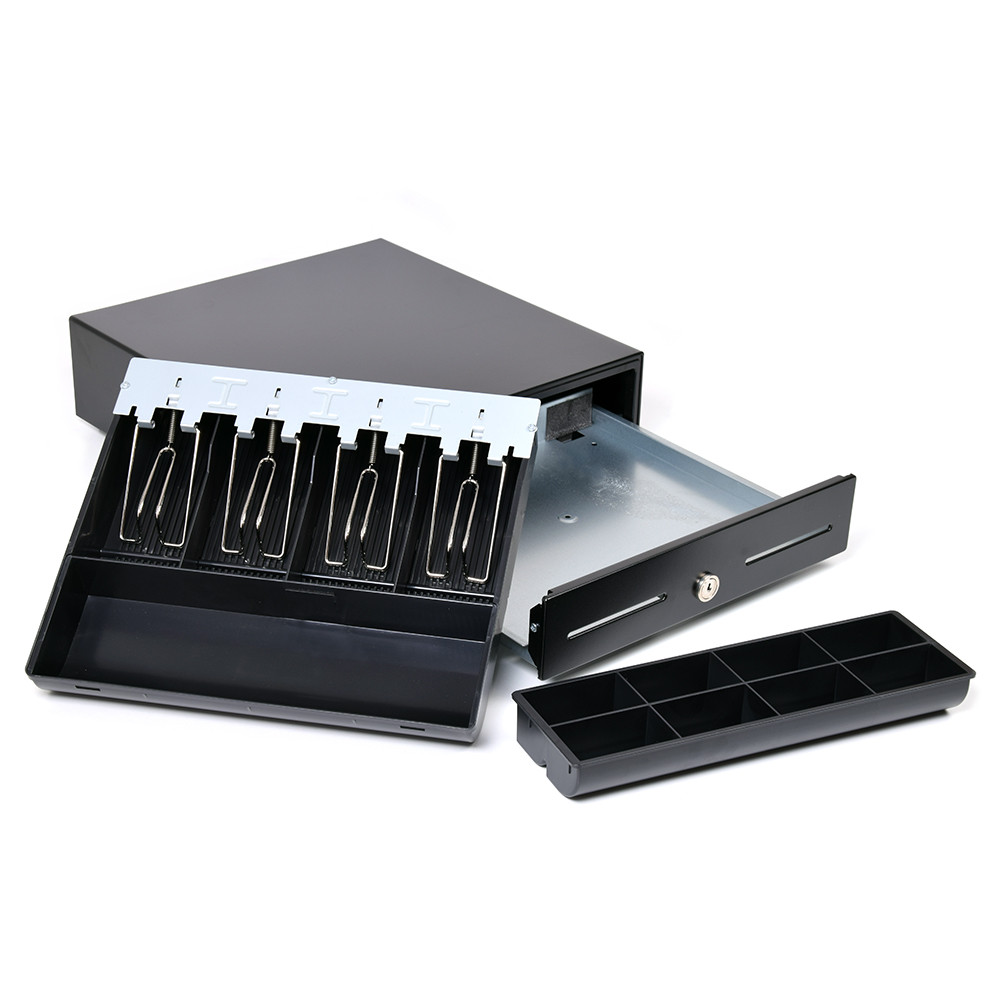• nagy szilárdságú fém ház • könnyen járó fém fiók • fém vezetősínek és műanyag görgők • kivehető műanyag kasszafiók betét (BIN 3348) • euróval használva négy rekeszes, forinttal használva viszont csak három rekeszes bankjegytartó (állítható szélességű) • rugós bankjegy leszorítók • kivehető nyolc rekeszes érmetartó • bedobónyílás a fiók előlapján (pl.: nagyobb címleteknek, csekkeknek, utalványoknak) • két kulcsállásos zár (kettő darab kulccsal) • kasszafiók használható a gyári BIN 3348 betéttel, de külön vásárolható hozzá BIN 3358 vertikális betét és LID 330 zárható fedő is • nyomással nyitható fiók (kulccsal csak zárható) • elektronikus és kulcsos nyitási lehetőség nincs • pénztárgép nélküli használathoz javasoljuk • fekete színben áruljuk