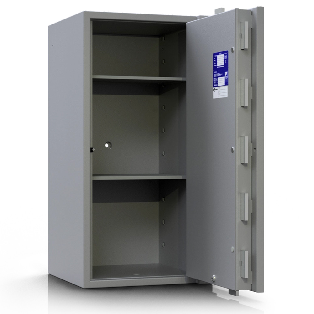 • DIN 4102 szerinti tűzálló szigetelés • többrétegű acél test (vékonyított a maximális térfogatért) • 80 mm vastag, többrétegű acél ajtó (szervizkulcsos) • 25 mm-es speciálisan megerősített beton töltet a testben és az ajtóban (lángvágás és flexelés ellen) • 25 mm-re kiemelkedő csillag alakú kilincs és zsanér • 180 fokos ajtónyitás, erős külső zsanérokkal • testbe forduló ajtó (zsanérlevágás ellen) • háromirányú zárás tömör acél hevederekkel • rozsdamentes belső szerkezet és kilincsmű (werk) • mangán acéllappal védett zárszerkezet (fúrás ellen) • rugós, műanyag huzalos passzív zár (felfúrásra, átvágásra és zárbeütésre is aktiválódik) • huzal elszakadása után a páncélszekrény nem nyitható • kisebb tüzek elleni védelem a testben és az ajtóban • kivehető és állítható magasságú polc(ok) • 14 mm-es rögzítő furat lefelé és hátrafelé • alapkivitelben kulcsos zárral, középszürke színben • többféle zárral, jobbos és balos ajtónyitással is rendelhető • prémium kategóriájú páncélszekrény igényeseknek