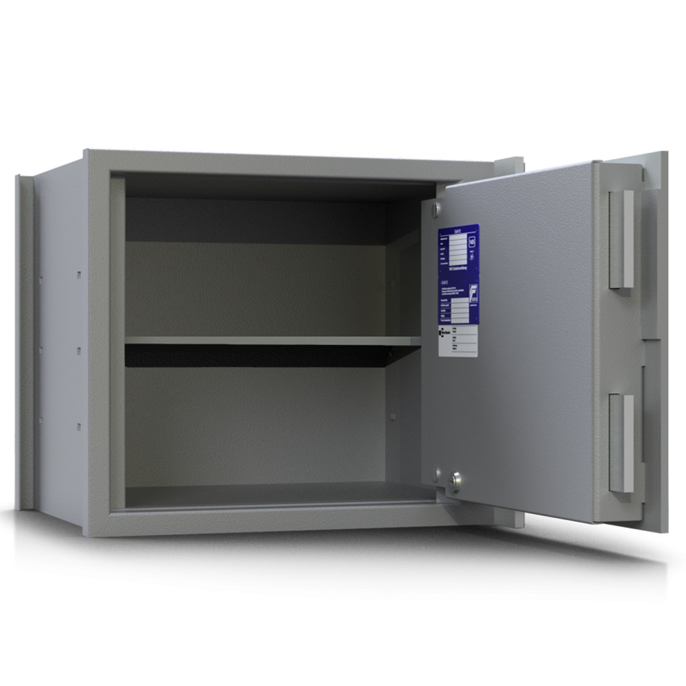 • 2mm-es acél test (hátsó acél pajzzsal is rendelhető) • 65mm vastag duplafalú ajtó, 8mm-es acél borítással • 20mm-re kiemelkedő kör alakú alumínium kilincs • 90 fokos ajtónyitás, erős belső zsanérokkal • háromirányú zárás tömör acél hevederekkel (15x90mm-es oldalra, 10x50mm-es felfelé és lefelé) • rozsdamentes belső szerkezet és kilincsmű (werk) • mangán acéllappal védett zárszerkezet (fúrás ellen) • rugós, műanyag huzalos passzív zár (felfúrásra, átvágásra és zárbeütésre is aktiválódik) • huzal elszakadása után a páncélszekrény nem nyitható • felfogató lap rezgésérzékelőnek (testen és az ajtón is) • kivehető és állítható magasságú polc(ok) • alapkivitelben világosszürke (RAL 7035) színben • többféle zárkombinációval és kiegészítővel is rendelhető • fali páncélszekrény csak igényeseknek