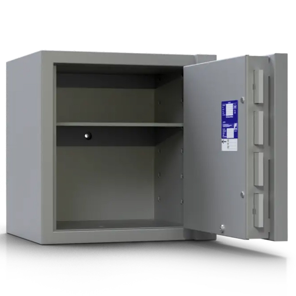 • speciálisan megerősített beton töltet a testben és az ajtóban (lángvágás és flexelés ellen) • 25 mm-re kiemelkedő csillag alakú kilincs és zsanér • 180 fokos ajtónyitás, erős külső zsanérokkal • testbe forduló ajtó (zsanérlevágás ellen) • háromirányú zárás tömör acél hevederekkel • rozsdamentes belső szerkezet és kilincsmű (werk) • mangán acéllappal védett zárszerkezet (fúrás ellen) • rugós, műanyag huzalos passzív zár (felfúrásra, átvágásra és zárbeütésre is aktiválódik) • huzal elszakadása után a páncélszekrény nem nyitható • alsó és hátsó kábelátvezető furat (riasztókábelnek) • felfogató lap rezgésérzékelőnek (testen és az ajtón is) • kivehető és állítható magasságú polc(ok) • 14 mm-es rögzítő furat lefelé és hátrafelé • alapkivitelben középszürke (RAL 7037) színben • többféle zárkombinációval, jobbos és balos ajtónyitással is rendelhető • prémium kategóriájú páncélszekrény igényeseknek