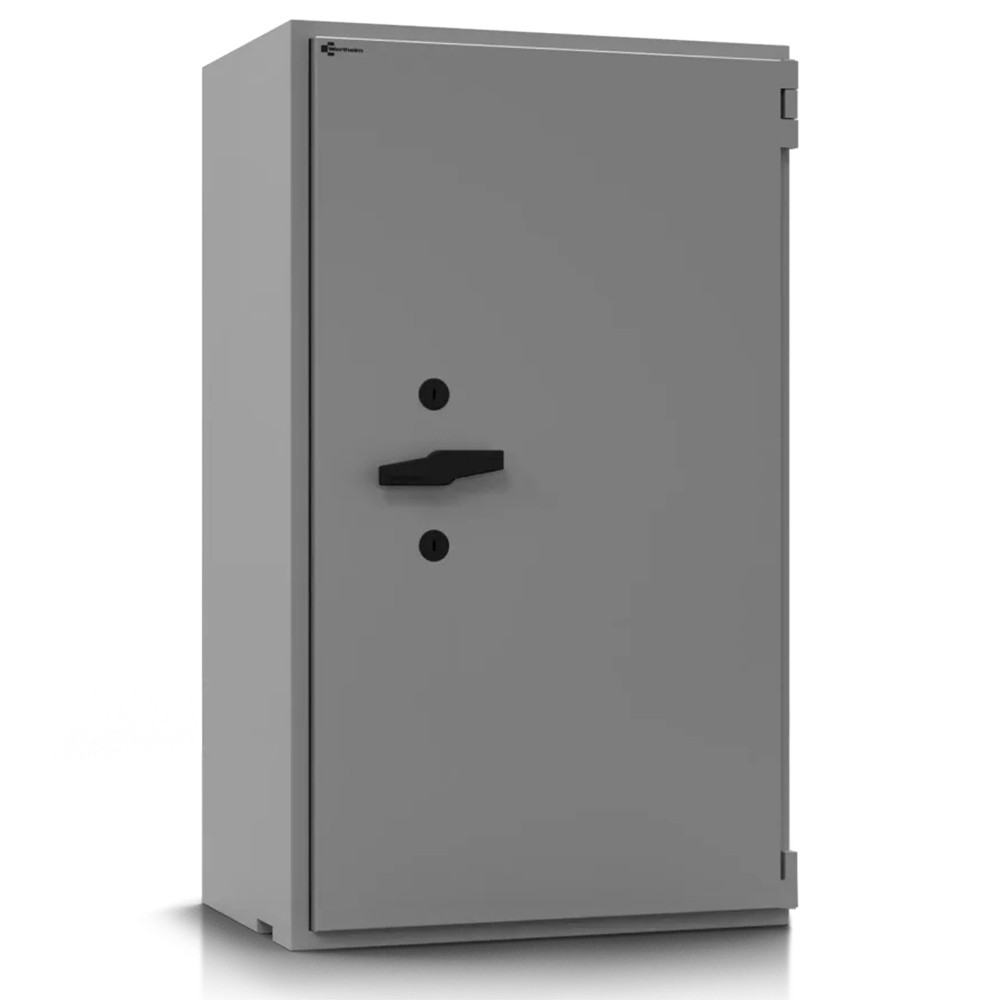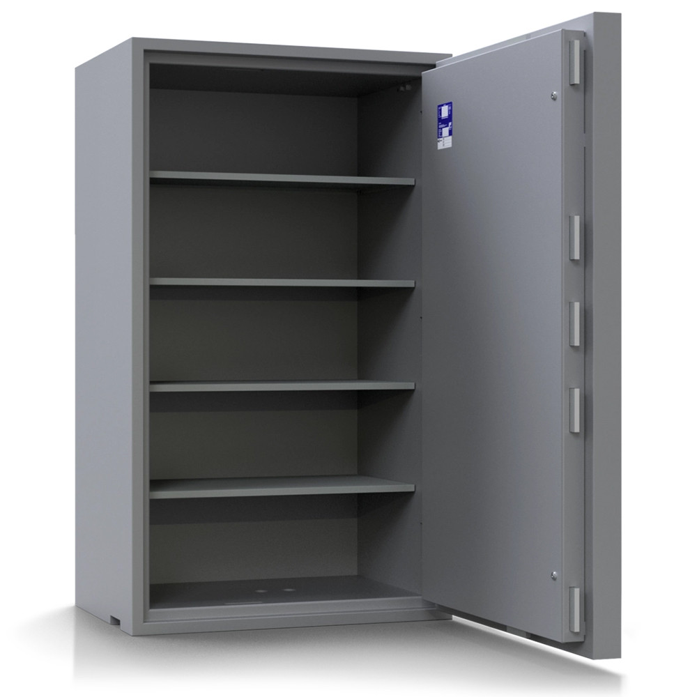 • 80mm vastag acél test, speciálisan megerősített beton töltettel (maximális védelem lángvágás és flexelés ellen) • 160mm vastag acél ajtó (ebből 70mm extra erős beton) • 60mm-re kiemelkedő elegáns alumínium kilincs • 180 fokos ajtónyitás, erős külső zsanérokkal • rögzítő fülek a zsanéroldalon (zsanérlevágás ellen) • háromirányú zárás acél hevederekkel (16x120mm) • ipari gyémánt bevonat az összes hevederen • rozsdamentes belső szerkezet és kilincsmű (werk) • mangán acéllappal védett zárszerkezet (fúrás ellen) • nagyméretű, üveglapos passzív zár (ütésre, felfúrásra, átvágásra és zárbeütésre is aktiválódik) • üveg berobbanása után a páncélszekrény nem nyitható • hátsó és oldalsó kábelátvezető furat (riasztókábelnek) • felfogató lap rezgésérzékelőnek (testen és az ajtón is) • 22mm-es rögzítő furat lefelé (műanyag kupakkal) • kivehető és állítható magasságú polc(ok) • világosszürke (RAL 7035) színben (kétszínű ajtóval) • többféle zárkombinációval és kiegészítővel is rendelhető • prémium kategóriájú páncélszekrény igényeseknek