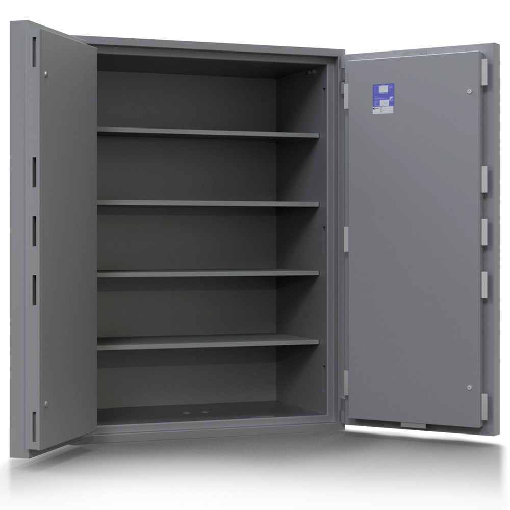 • 80mm vastag acél test, speciálisan megerősített beton töltettel (maximális védelem lángvágás és flexelés ellen) • 160mm vastag acél ajtó (ebből 70mm extra erős beton) • 60mm-re kiemelkedő elegáns alumínium kilincs • 180 fokos ajtónyitás, erős külső zsanérokkal • rögzítő fülek a zsanéroldalon (zsanérlevágás ellen) • háromirányú zárás acél hevederekkel (16x120mm) • ipari gyémánt bevonat az összes hevederen • rozsdamentes belső szerkezet és kilincsmű (werk) • mangán acéllappal védett zárszerkezet (fúrás ellen) • nagyméretű, üveglapos passzív zár (ütésre, felfúrásra, átvágásra és zárbeütésre is aktiválódik) • üveg berobbanása után a páncélszekrény nem nyitható • hátsó és oldalsó kábelátvezető furat (riasztókábelnek) • felfogató lap rezgésérzékelőnek (testen és az ajtón is) • 22mm-es rögzítő furat lefelé (műanyag kupakkal) • kivehető és állítható magasságú polc(ok) • világosszürke (RAL 7035) színben (kétszínű ajtóval) • többféle zárkombinációval és kiegészítővel is rendelhető • prémium kategóriájú páncélszekrény igényeseknek