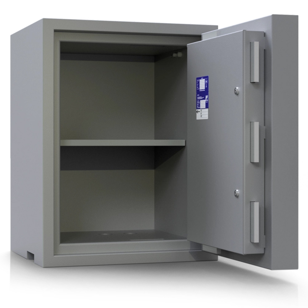 • 80mm vastag acél test, speciálisan megerősített beton töltettel (maximális védelem lángvágás és flexelés ellen) • 160mm vastag acél ajtó (ebből 70mm extra erős beton) • 60mm-re kiemelkedő elegáns alumínium kilincs • 180 fokos ajtónyitás, erős külső zsanérokkal • rögzítő fülek a zsanéroldalon (zsanérlevágás ellen) • háromirányú zárás acél hevederekkel (16x120mm) • ipari gyémánt bevonat az összes hevederen • rozsdamentes belső szerkezet és kilincsmű (werk) • mangán acéllappal védett zárszerkezet (fúrás ellen) • nagyméretű, üveglapos passzív zár (ütésre, felfúrásra, átvágásra és zárbeütésre is aktiválódik) • üveg berobbanása után a páncélszekrény nem nyitható • hátsó és oldalsó kábelátvezető furat (riasztókábelnek) • felfogató lap rezgésérzékelőnek (testen és az ajtón is) • 22mm-es rögzítő furat lefelé (műanyag kupakkal) • kivehető és állítható magasságú polc(ok) • világosszürke (RAL 7035) színben (kétszínű ajtóval) • többféle zárkombinációval és kiegészítővel is rendelhető • prémium kategóriájú páncélszekrény igényeseknek