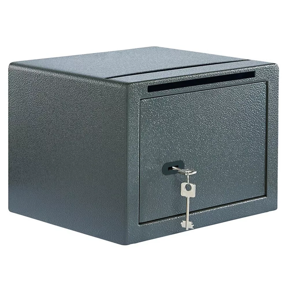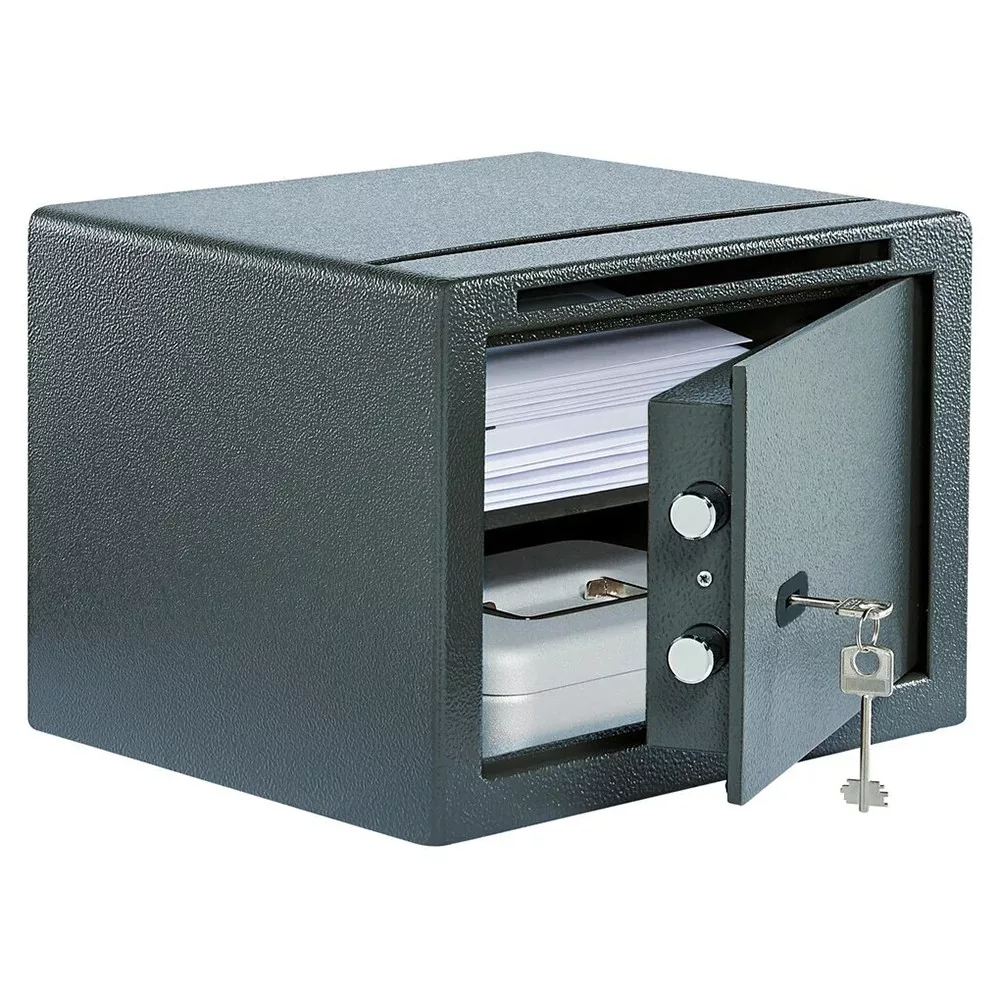 • megbízható bútorszéf két bedobónyílással • nagyobb méretű bedobónyílás a széf tetején (325 mm x 10 mm) • kisebb méretű bedobónyílás az ajtó felett (240 mm x 10 mm) • bankjegyek, borítékok, A4-es iratok gyors elzárásához • 2 mm-es egyfalú acél test • 48 mm vastag ajtó, 6 mm-es acél borítással • 90 fokos ajtónyitás jobboldali zsanérokkal • egyirányú zárás 22 mm-es acél hevederekkel • Secu 6 lamellás duplatollú kulcsos zár • 15.000 feletti zárási variációval • kettő darab 76 mm-es kulccsal • rögzítő furat lefelé és hátrafelé • nyerskulcs típusa: Rohling 17C