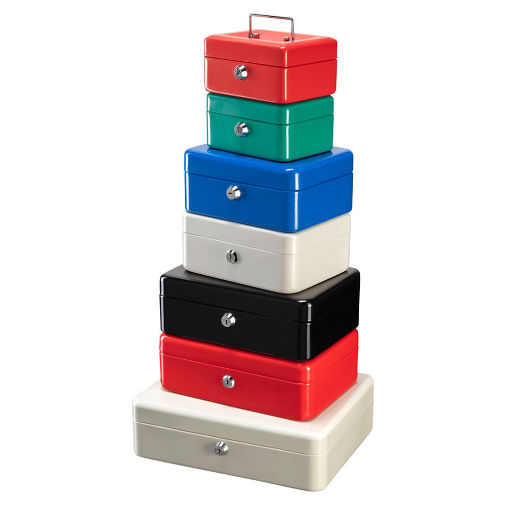 • acéllemez pénzkazetta • rejtett belső zsanérozás • négyszögletes forma lekerekített élekkel • süllyesztett krómozott fém fogantyú • kivehető műanyag aprópénztartó • alatta hely a bankjegyeknek • krómozott lamellás zár • kettő darab kulccsal • többféle méretben és színben forgalmazzuk • 5012 modellnél aprópénz bedobó nyílás található a fedélen (gyerek persely)