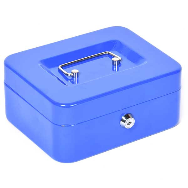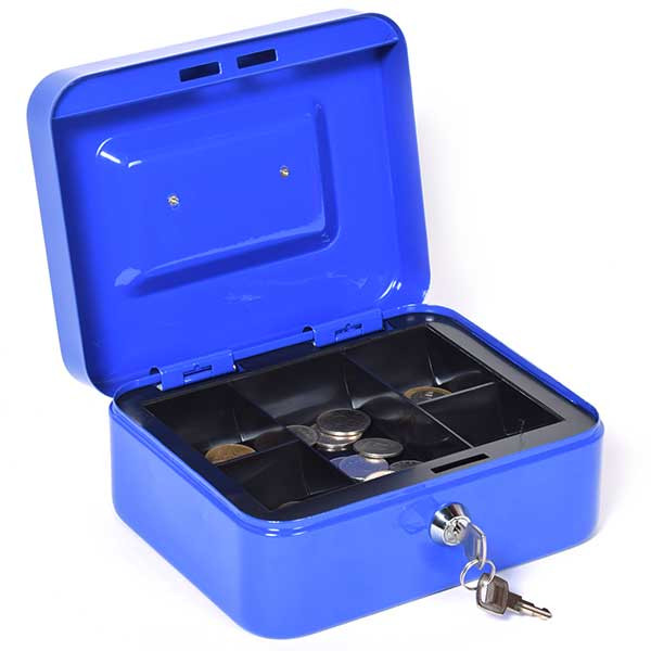 • acéllemez pénzkazetta • rejtett belső zsanérozás • négyszögletes forma lekerekített élekkel • süllyesztett fém fogantyú • kivehető műanyag aprópénztartó • alatta hely a bankjegyeknek • krómozott lamellás zár • kettő darab kulccsal • többféle méretben és színben