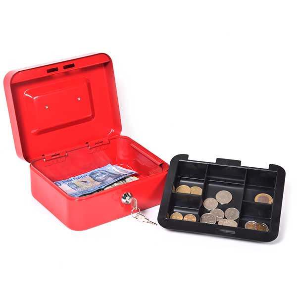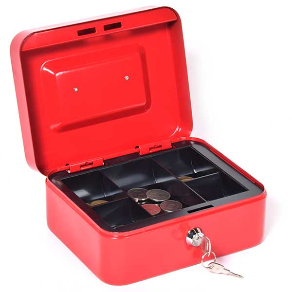 • acéllemez pénzkazetta • rejtett belső zsanérozás • négyszögletes forma lekerekített élekkel • süllyesztett fém fogantyú • kivehető műanyag aprópénztartó • alatta hely a bankjegyeknek • krómozott lamellás zár • kettő darab kulccsal • többféle méretben és színben